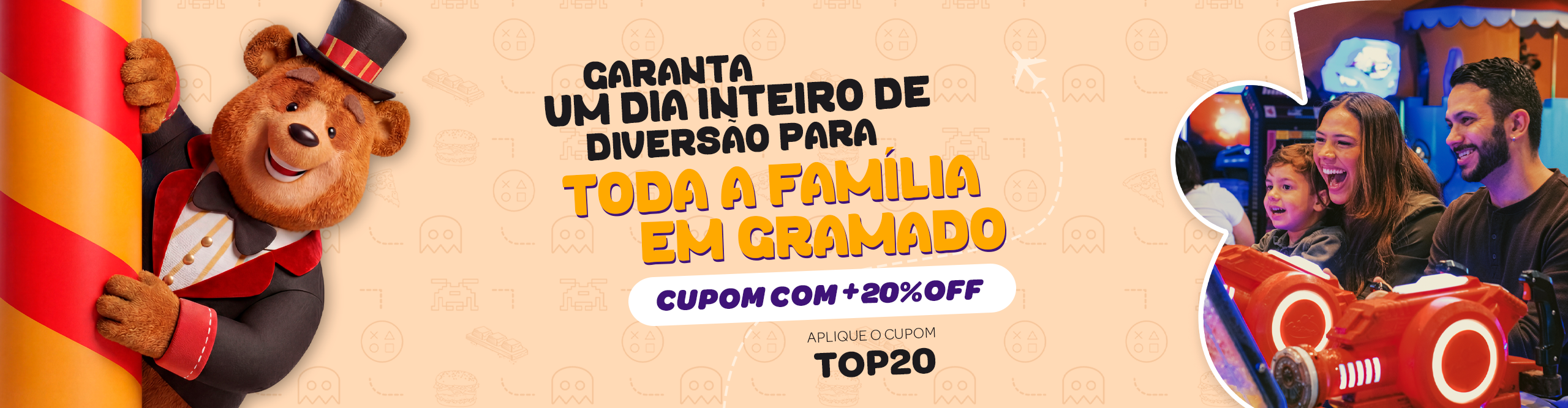 2 INGRESSOS ADULTO • 2 INGRESSOS INFANTIL • 4 RODÍZIOS DE PIZZA • 20 FICHINHAS • 1 PIPOCA G -